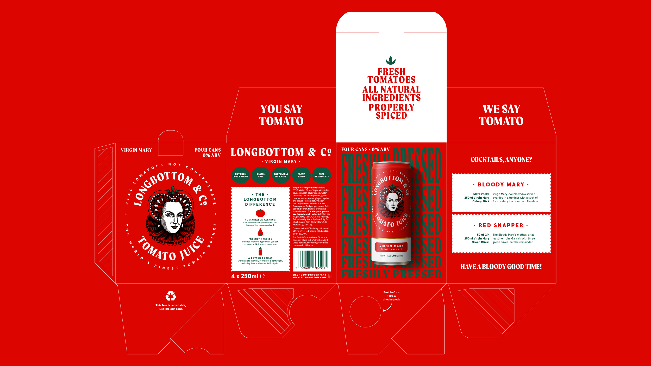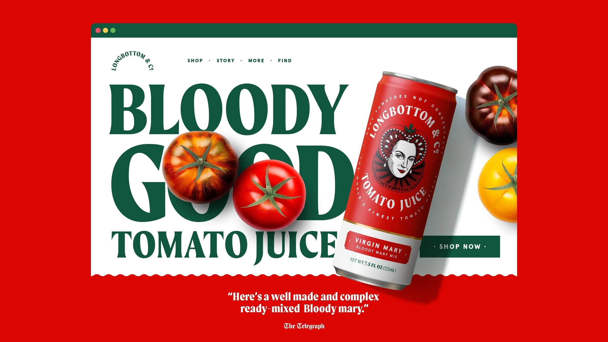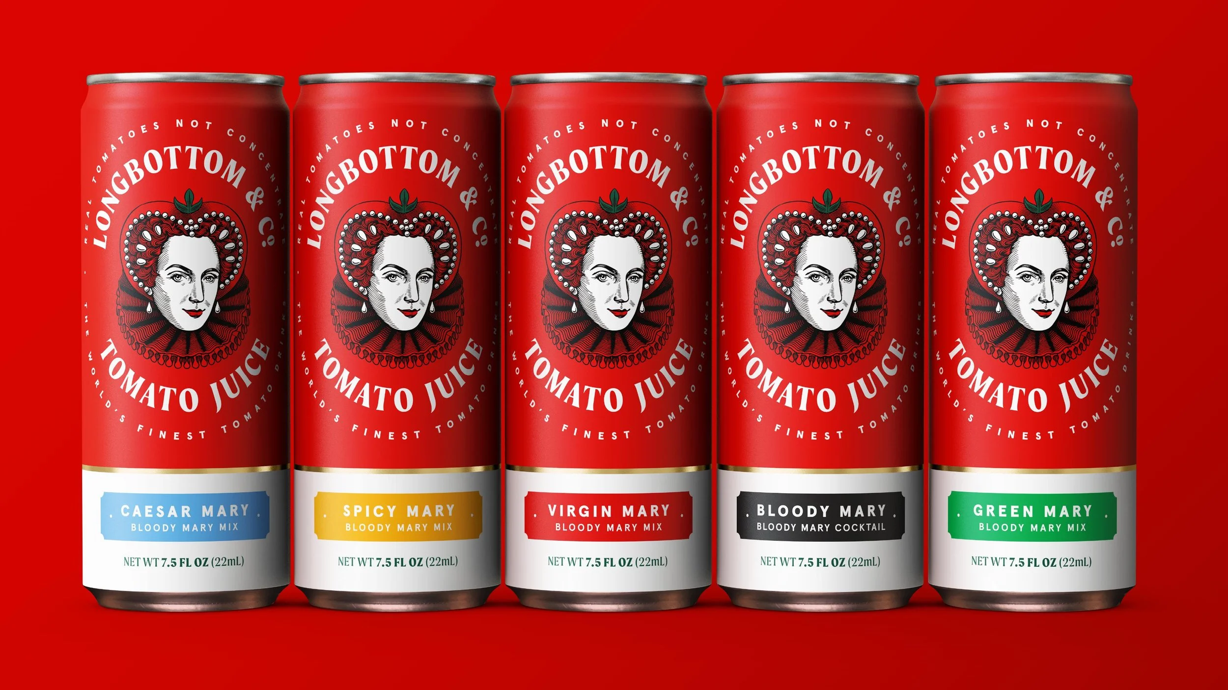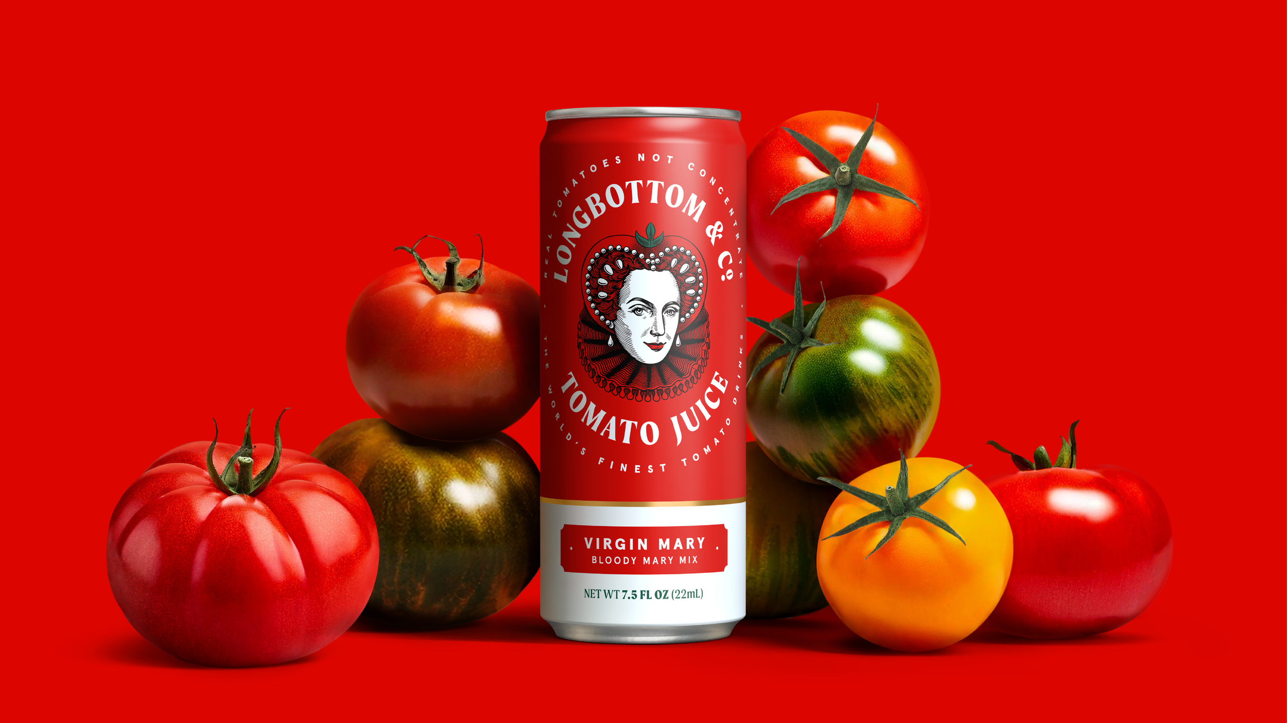Ensconced within a crafted typographic roundel and a vivid world inspired by the palette of the freshest tomatoes, our Mary is elevated to the status of branding royalty.