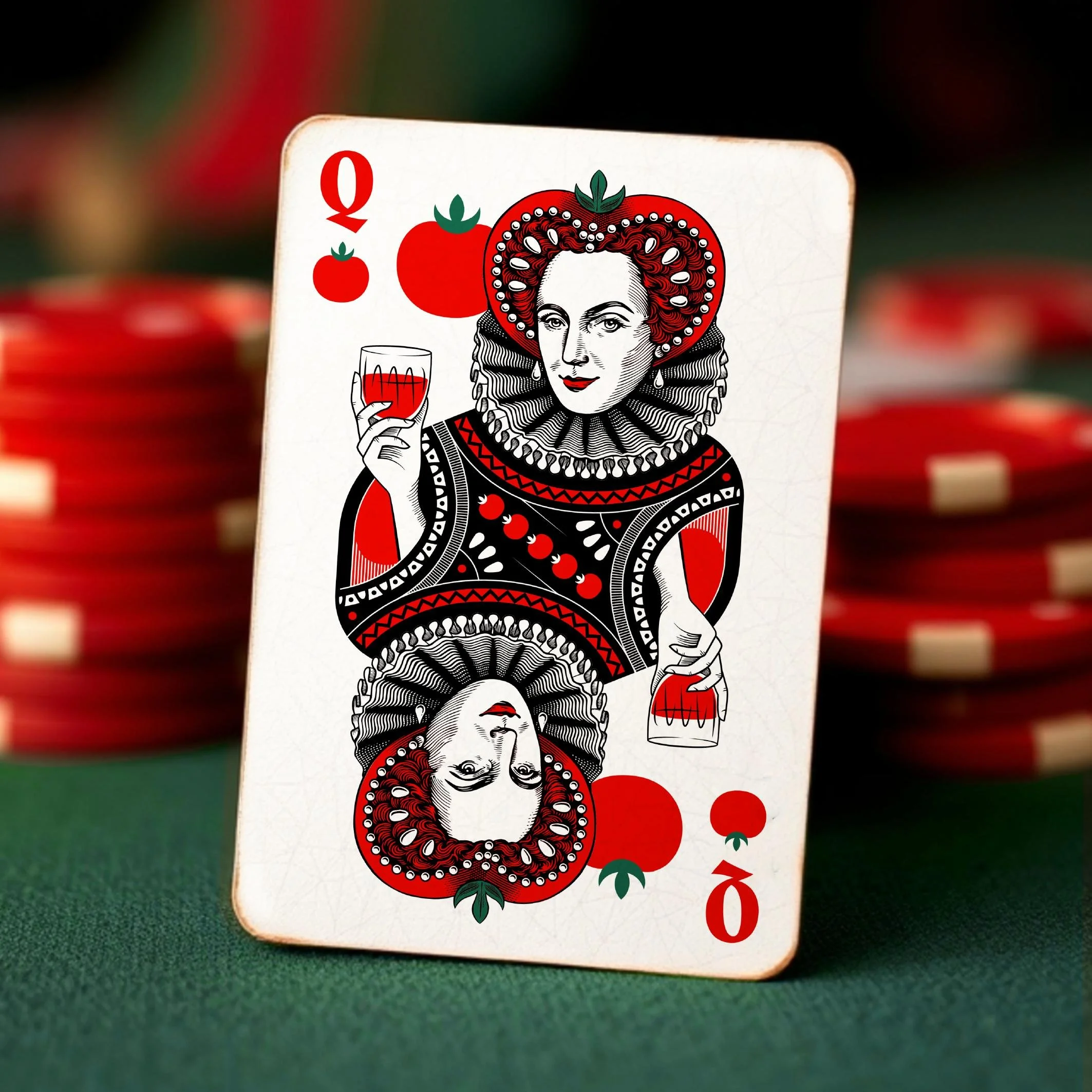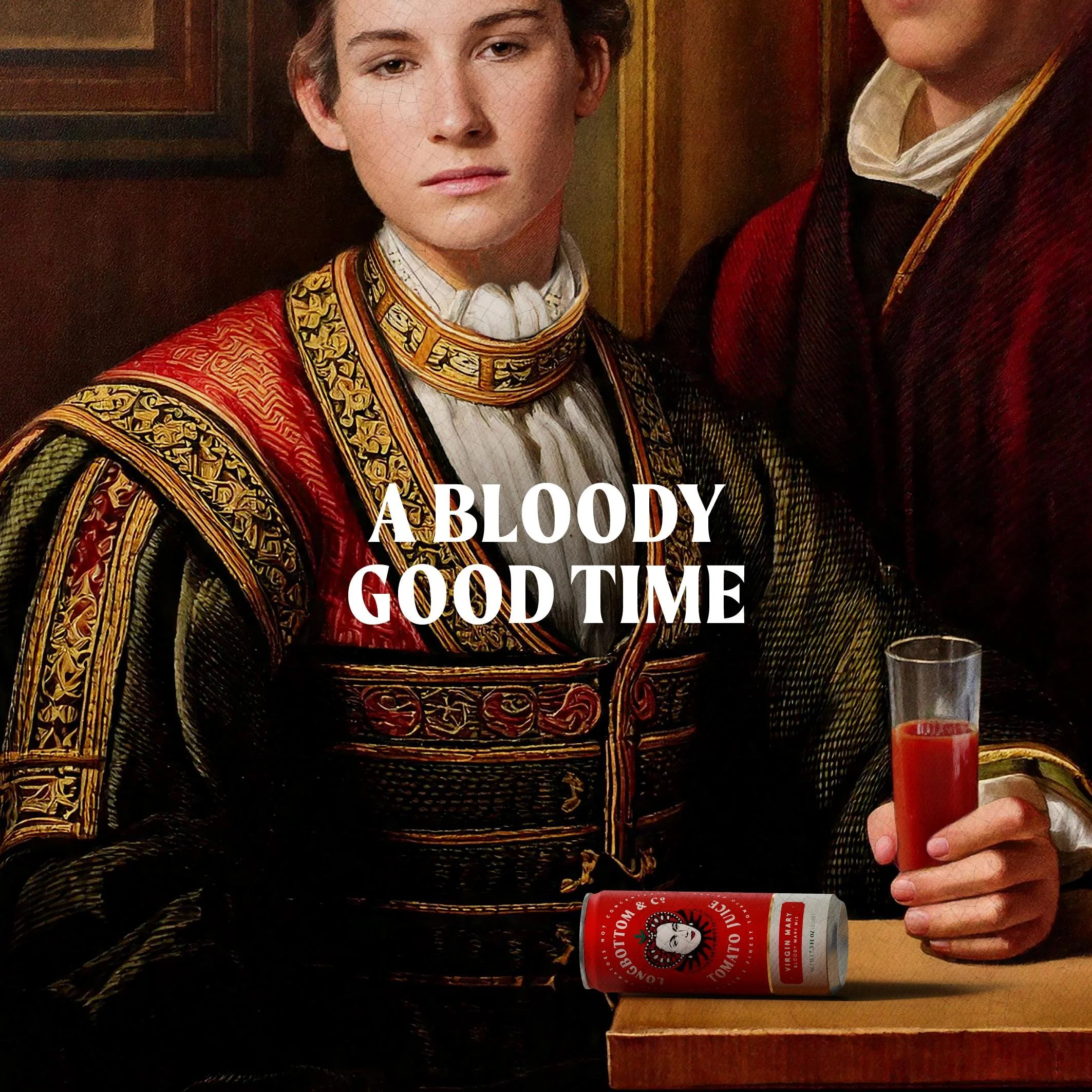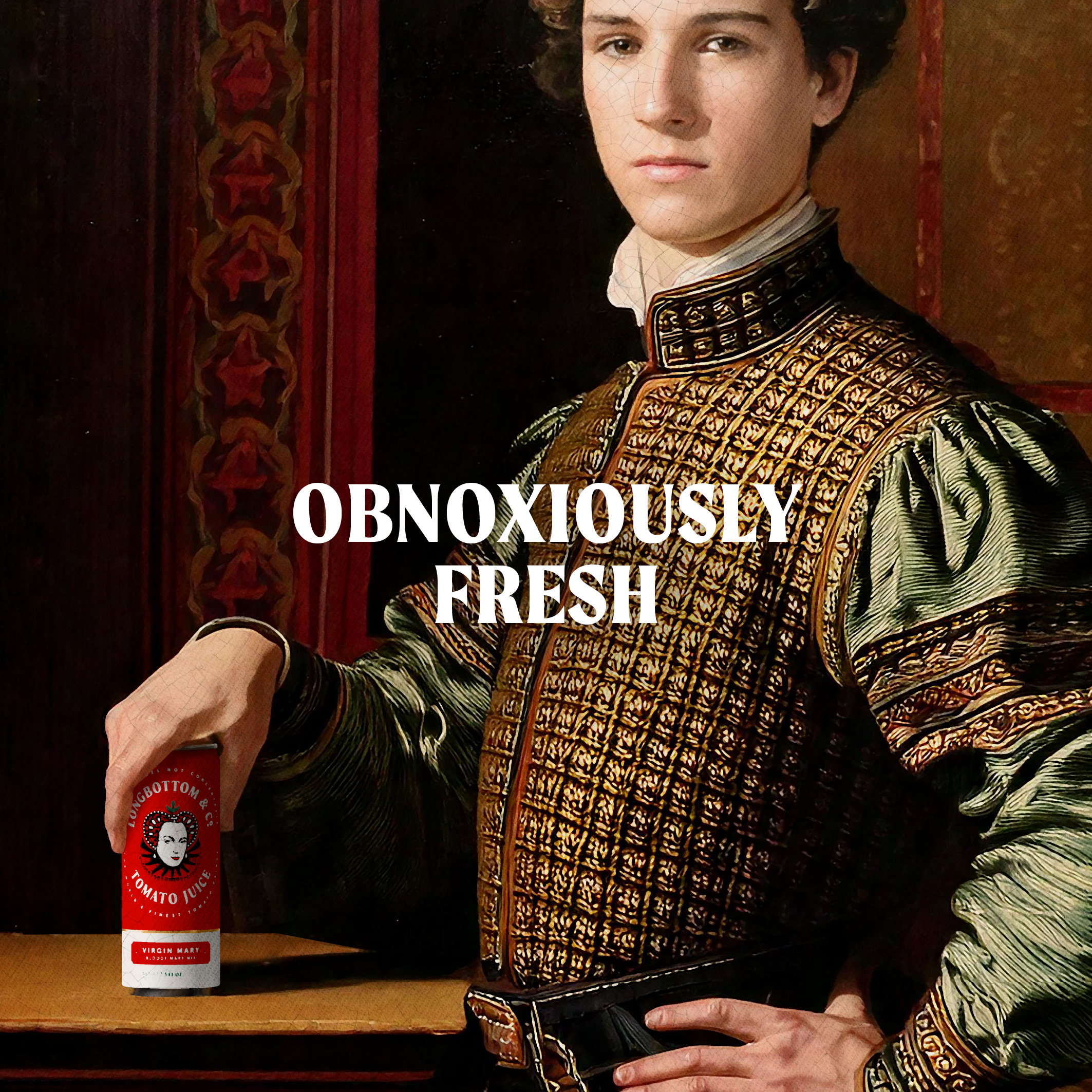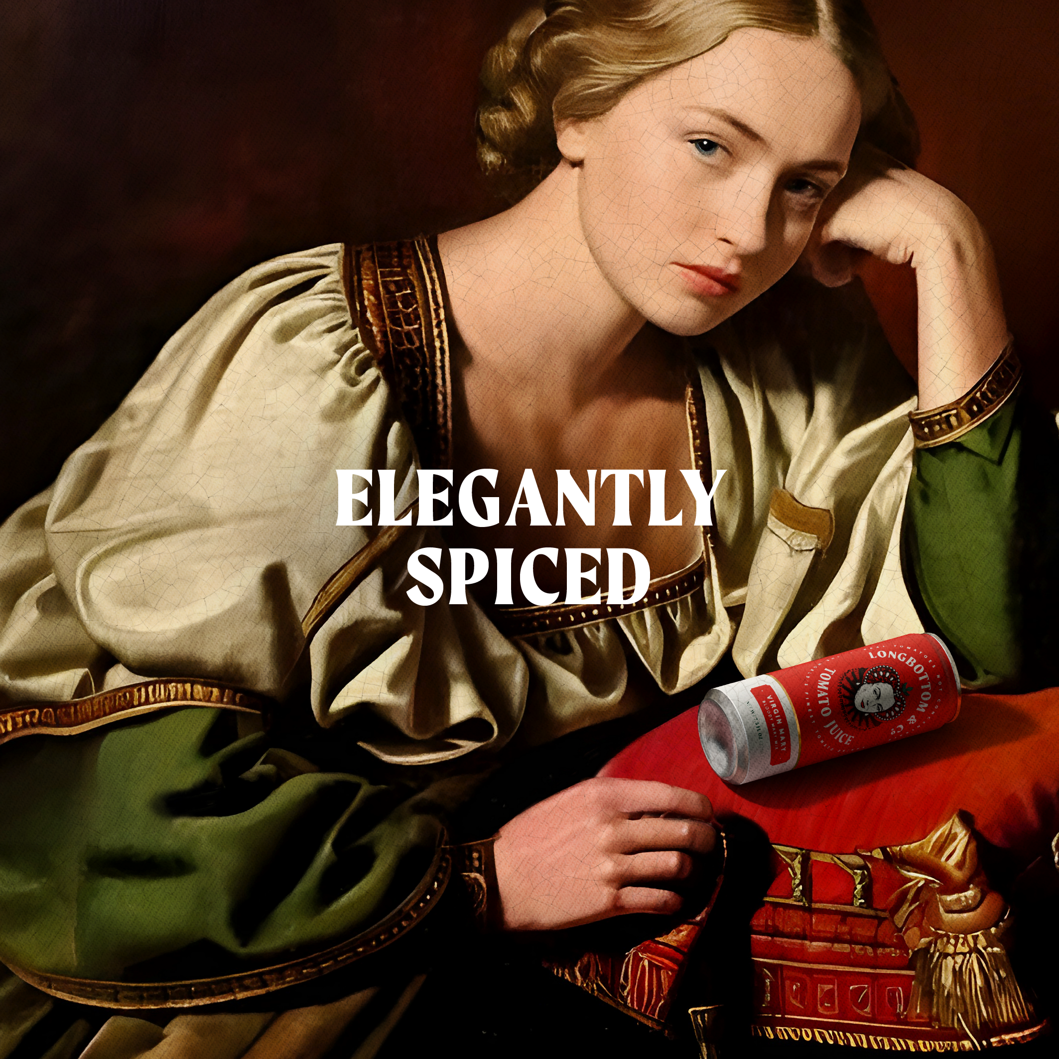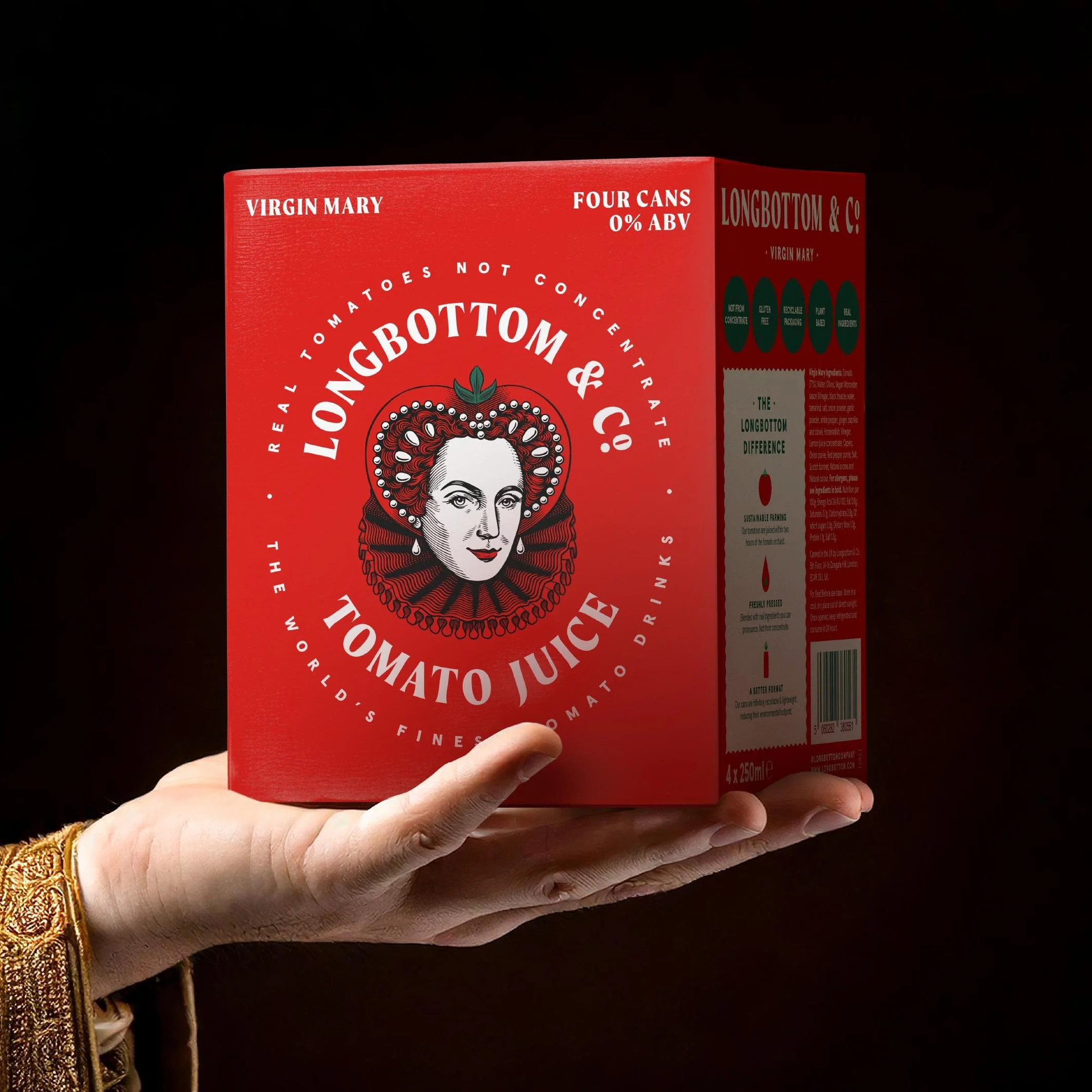 Ensconced within a crafted typographic roundel and a vivid world inspired by the palette of the freshest tomatoes, our Mary is elevated to the status of branding royalty.